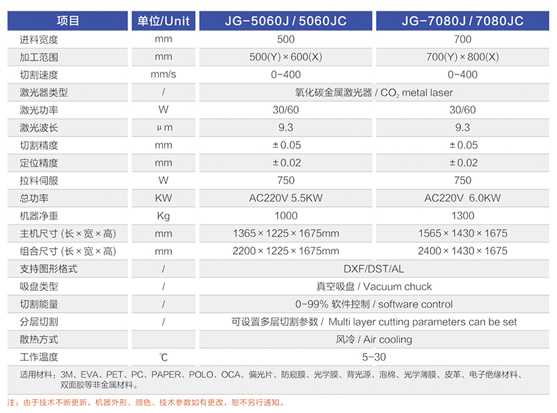 适用材料范围: 3M/PET/PC/PAPER/OCA/防窥膜/防爆膜/背光源/扩散/泡棉/光学薄膜/电子绝缘材料/皮革/双面胶/特殊材料石墨烯等