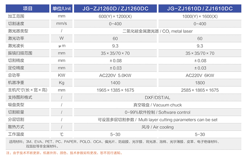 适用材料范围: 3M/PET/PC/PAPER/OCA/防窥膜/防爆膜/背光源/扩散/泡棉/光学薄膜/电子绝缘材料/皮革/双面胶/特殊材料