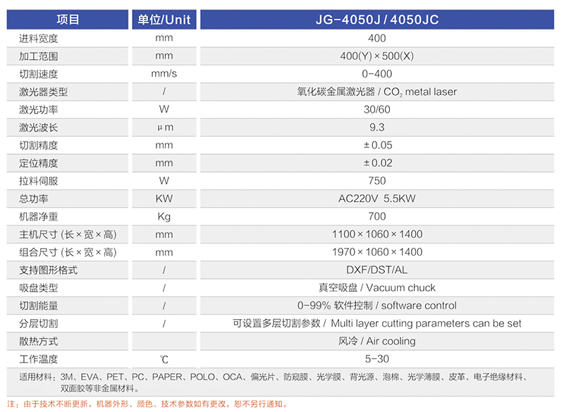 适用材料范围: 3M/PET/PC/PAPER/OCA/防窥膜/防爆膜/背光源/扩散/泡棉/光学薄膜/电子绝缘材料/皮革/双面胶/特殊材料石墨烯等